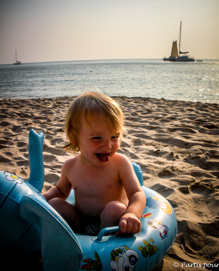 Chaque jour, en fin de journée, nous nous baignions et jouions sur la plage. L’eau était chaude et translucide. Grégoire s’amusait avec ses petites voitures sur la plage. Sacha explorait les environs et escaladait tout ce qui était possible d’escalader. Attiré par l’eau, il courait vers les vagues. Toutefois, pas question d’y mettre plus que les pieds. Je suis dons allée lui chercher une bouée éléphant afin de l’attirer dans l’eau. Mais, malgré cette magnifique bouée, rien n’y a fait. Sacha n’aimait pas se baigner, sauf dans mes bras. Ces moments de fin de journée sont les plus beaux que nous ayons passés sur l’île. Des moments simples de complicité et de joie quand nous nagions ensemble et jouions dans l’eau ou sur la plage.